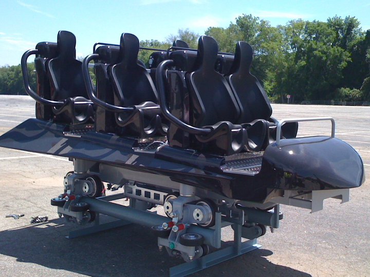 Primera foto de un carro de Dare Devil Dive en Six Flags Over Georgia, la primera montaña rusa de tipo Eurofighter con barras de sujeción así: